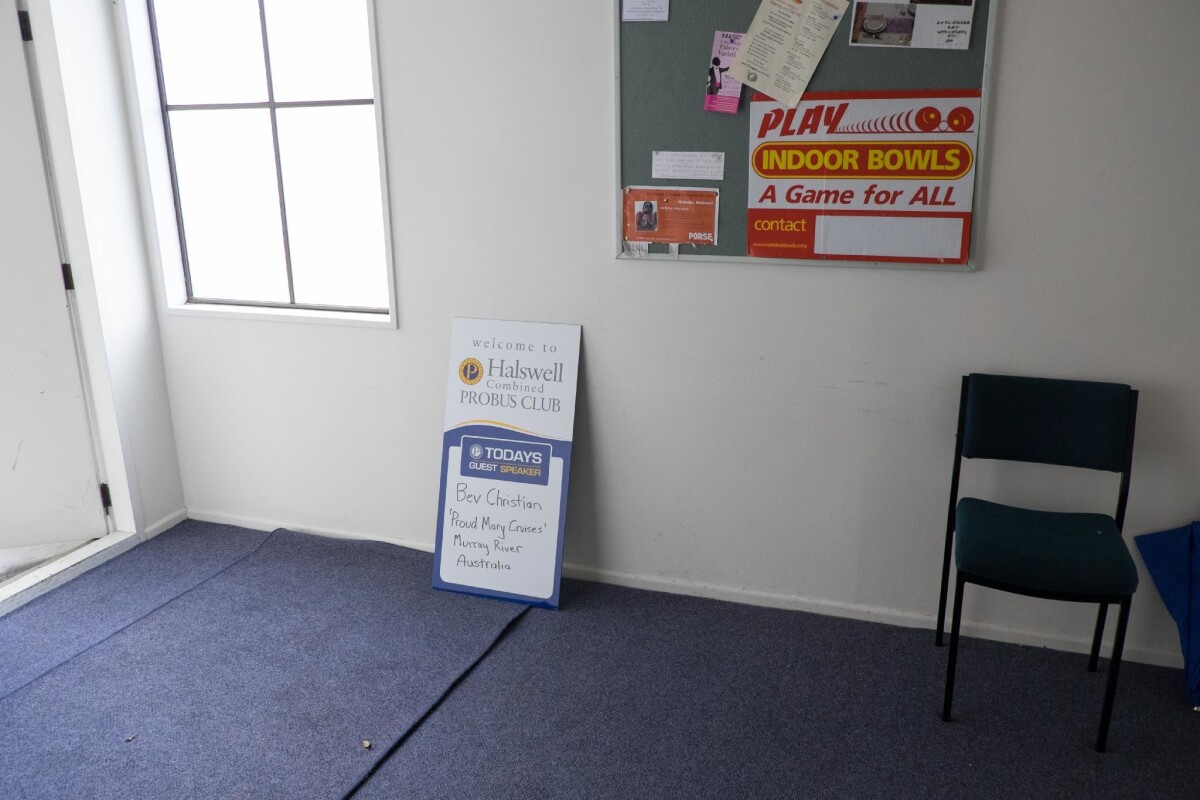 Sign in the entrance to Halswell Community Hall at 450 Halswell Road advertising the guest speaker at the Halswell Probus Club, Bev Christian, who will be talking about 'Proud Mary Cruises' on the Murray River, Australia.