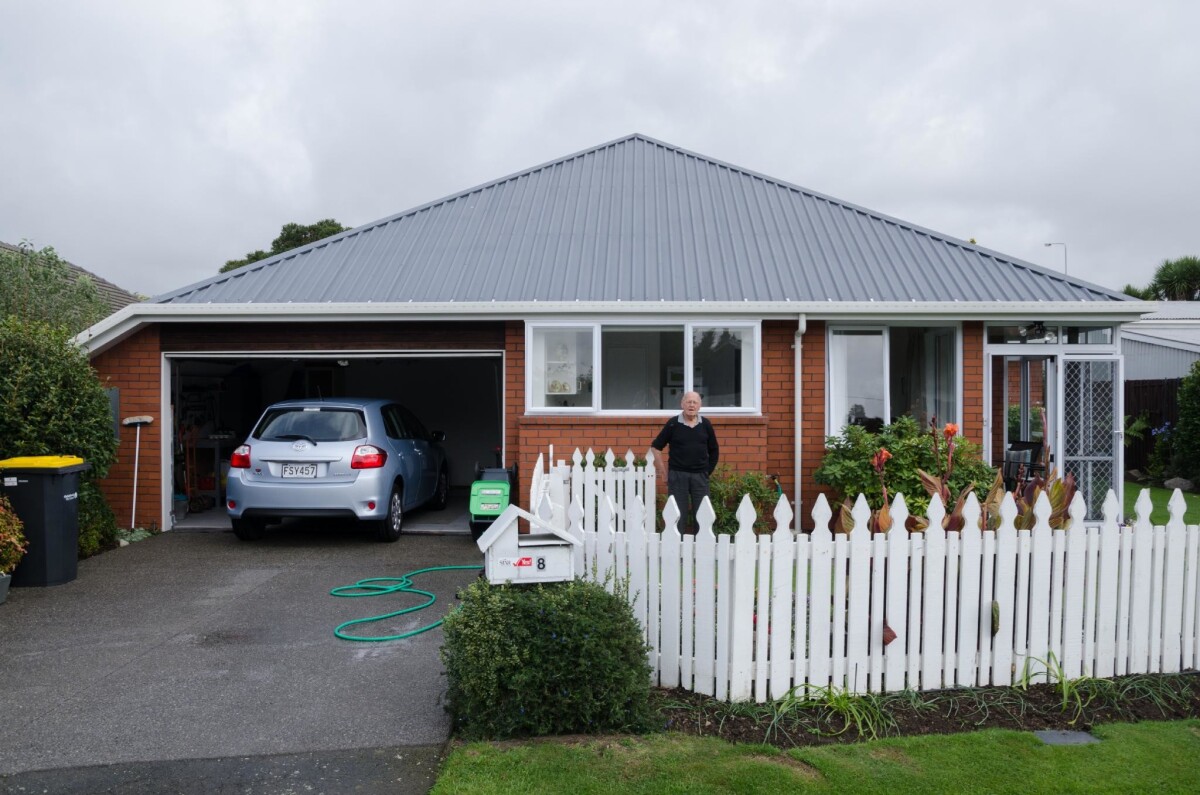 Man posing for portrait outside his house on Kennedys Bush Road, Halswell