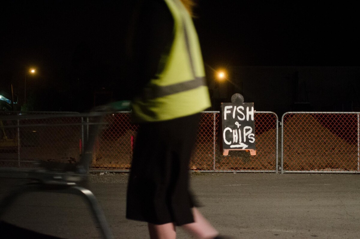 A handwritten sign for fish and chips on railings in Halswell. A cyclist is pushing their bicycle past in the foreground.