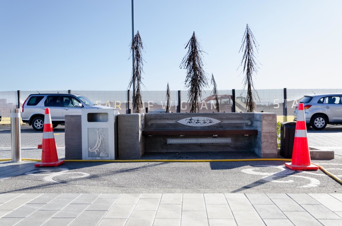 View of a bench outside The Landing town centre, on The Runway, Wigram Skies. Two traffic cones are either side of the bench.