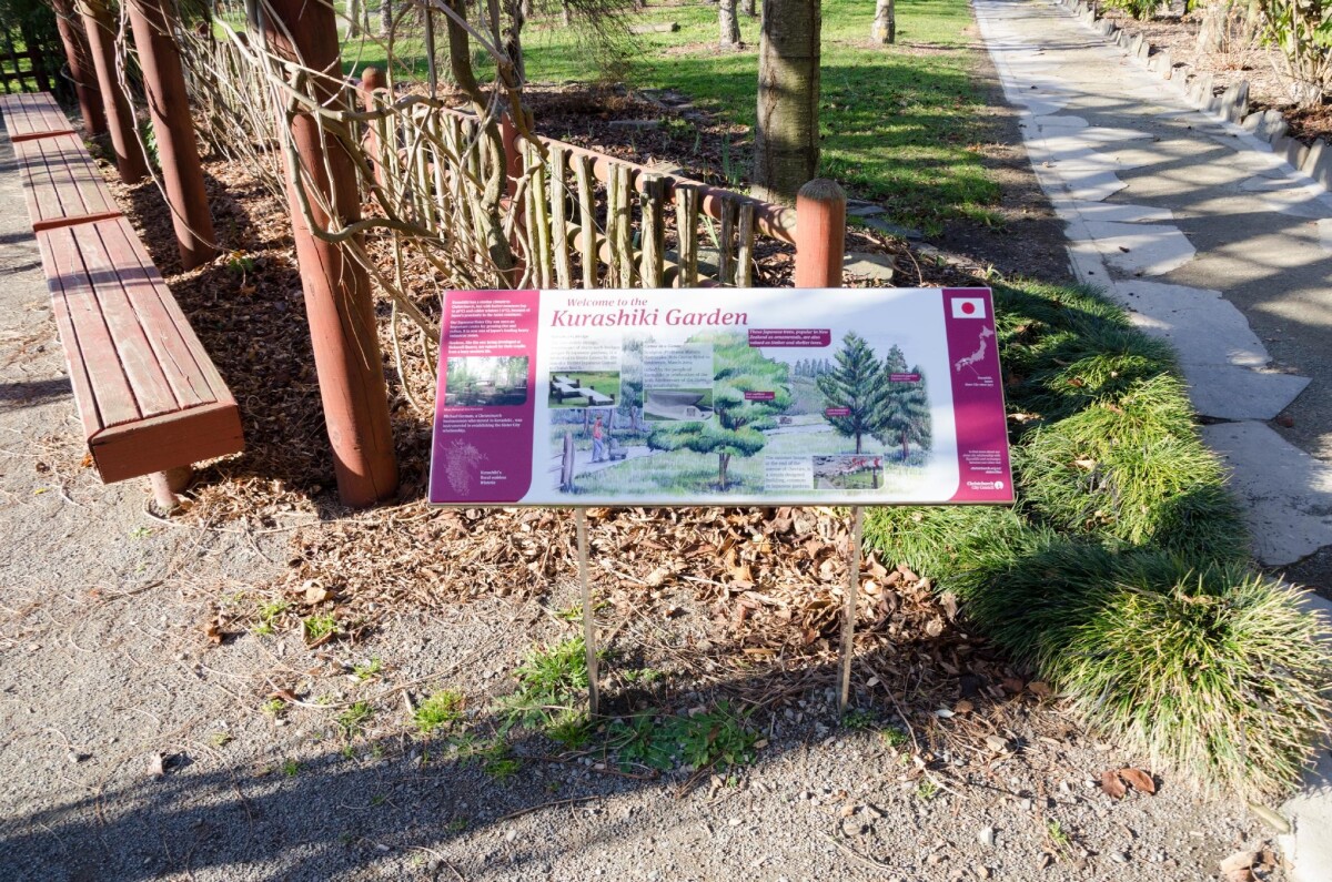 Close-up of an information board for the Kurashiki Garden at Halswell Quarry park.