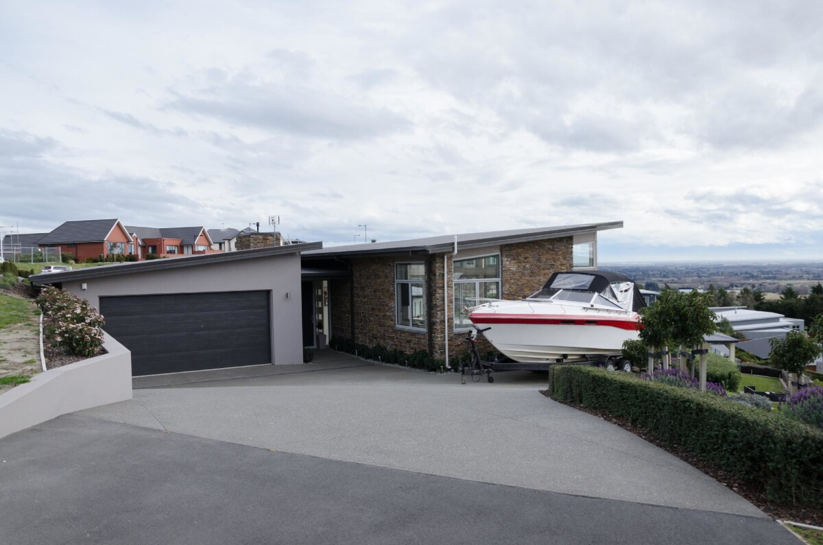 Exterior of a house and a boat at 1 Rockhill Drive, Kennedys Bush, Halswell.