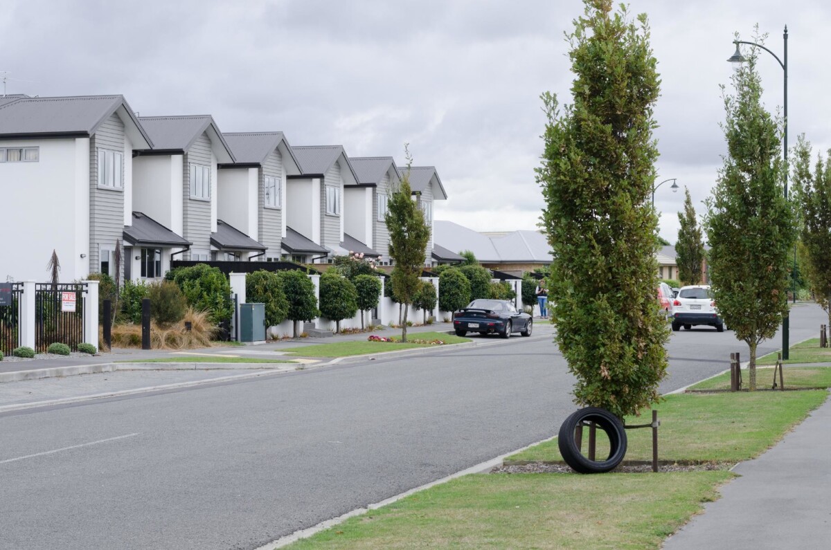 View of a tire and a tree on Mustang Avenue outside houses at Wigram Skies.
