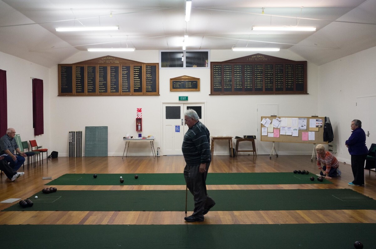Kelvin walks the green at the Halswell Indoor Bowls Club, the Halswell Hall.