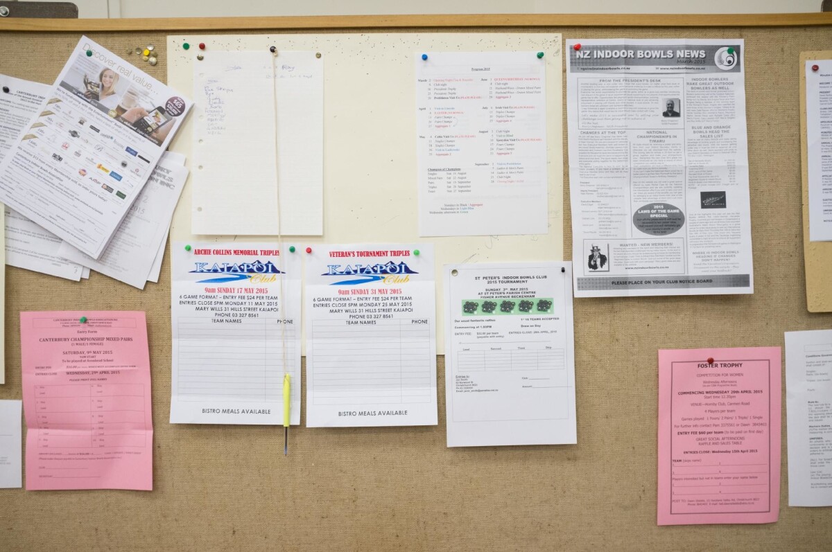 Indoor bowls notice board at the Halswell Indoor Bowls Club, the Halswell Hall.