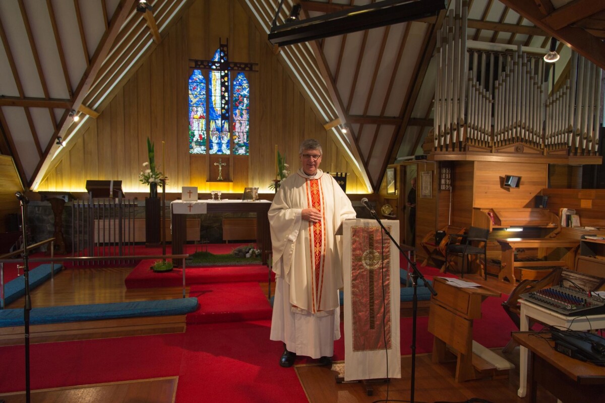 Interior of St Mary's Anglican Church with the temporary replacement vicar stood at the altar.