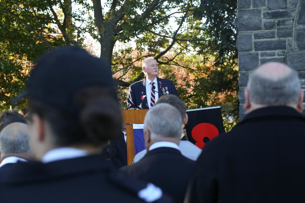Ron, a war veteran, speaking at the Anzac Day service at 322 Halswell Road at the Halswell War Memorial.
