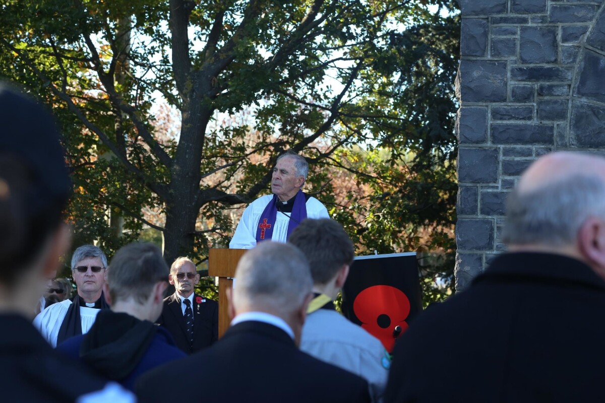 A vicar speaking at the Anzac Day service at 322 Halswell Road at the Halswell War Memorial.