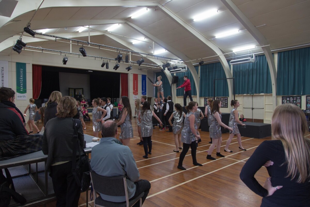 Students at Hillmorton High School in costume with an audience in the school hall during Stage Challenge practice.