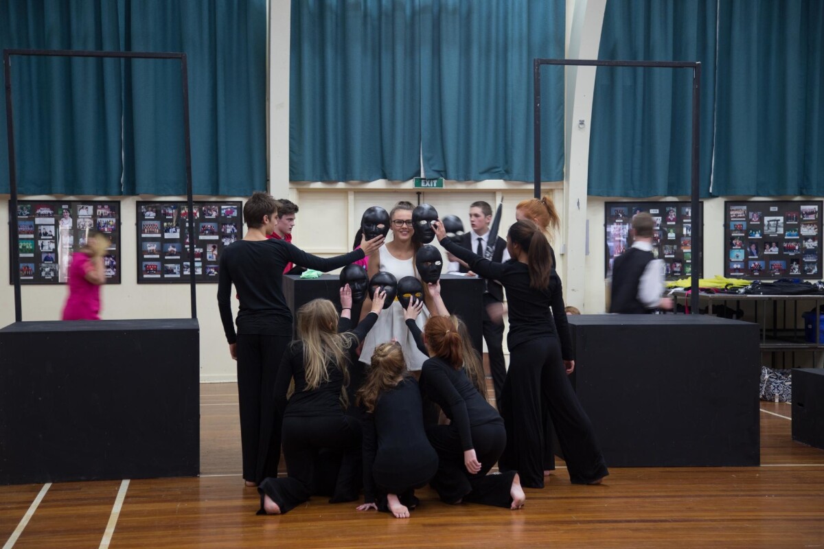Students at Hillmorton High School in costume in the school hall during Stage Challenge practice.