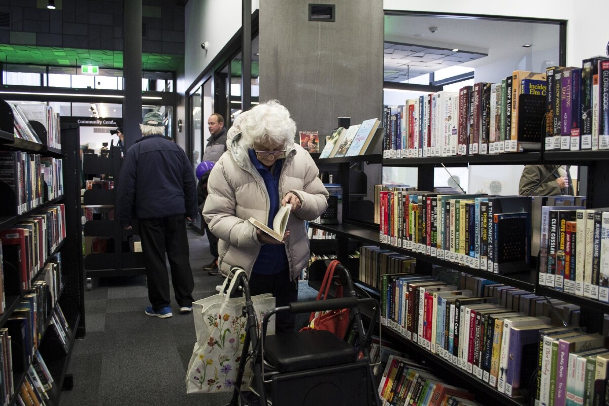 Senior citizen looking through books at the new Bishopdale Library opening.