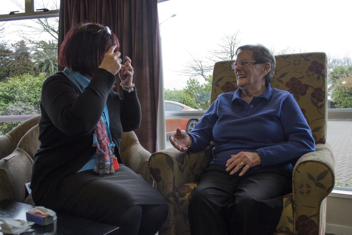 Anne-Marie laughing with an elderly resident of the Bupa rest home during beauty time at 235 Harewood Road, Bishopdale.