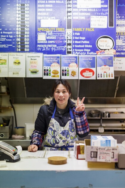 Kathy behind the till at Blue Dolphin Fish and Chips in ...