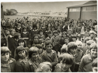 Large crowd of students stood on the grounds of Breens ...