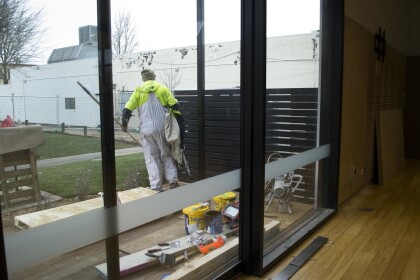 Worker doing the final finishing on the new Bishopdale Library ...