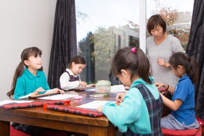 A group of four children at a Abacus class taught by Machiko at ...