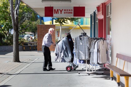 A man packing up displays of clothing outside My Men's Store at ...