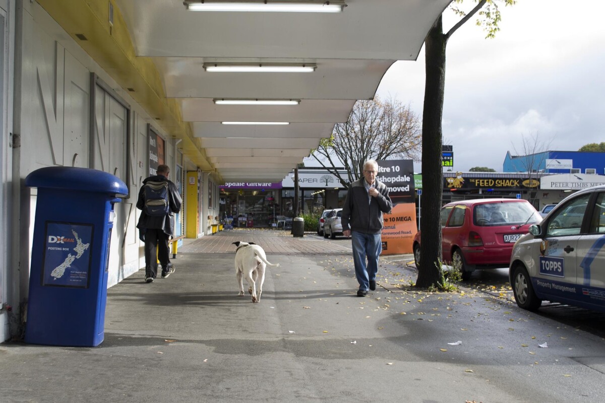 View of shops and shoppers at Bishopdale Village Mall on a Thursday afternoon.