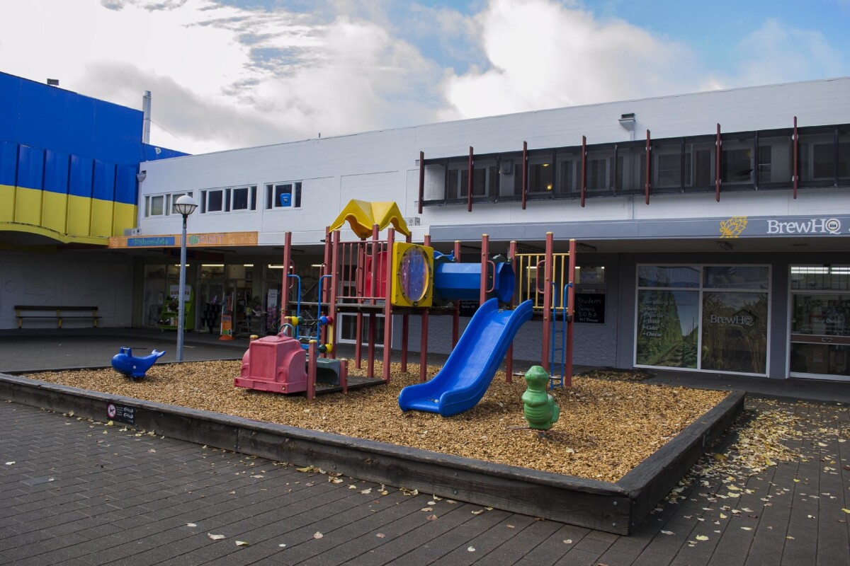 View of a playground in the centre of Bishopdale Village Mall. Brew HQ and a Florist shop are in the background.