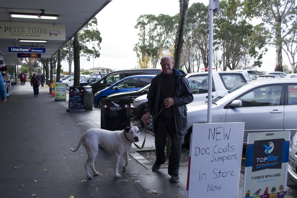Man walking his dog through Bishopdale Village Mall with Unichem Bishopdale Pharmacy and Peter Timbs Meats in the background.