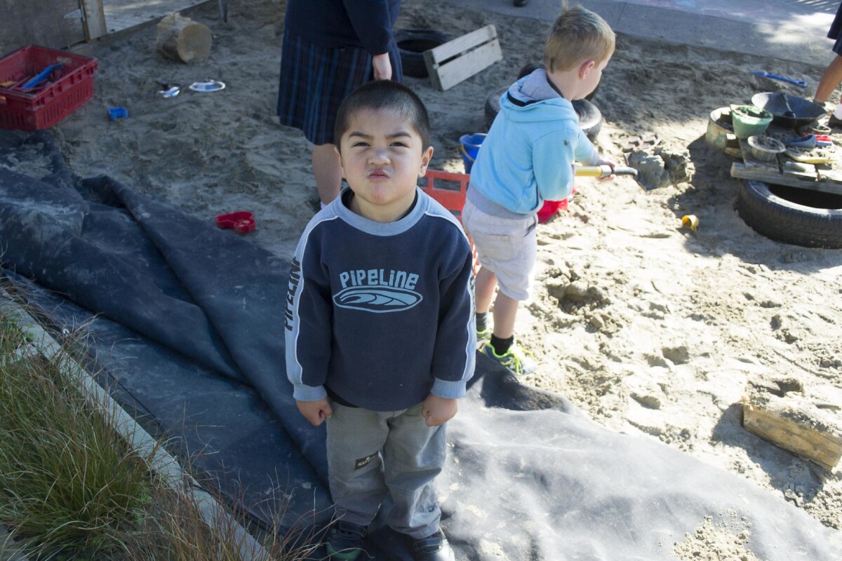 A child pulling a face for the camera in the sandpit at the Bishopdale Community Preschool.