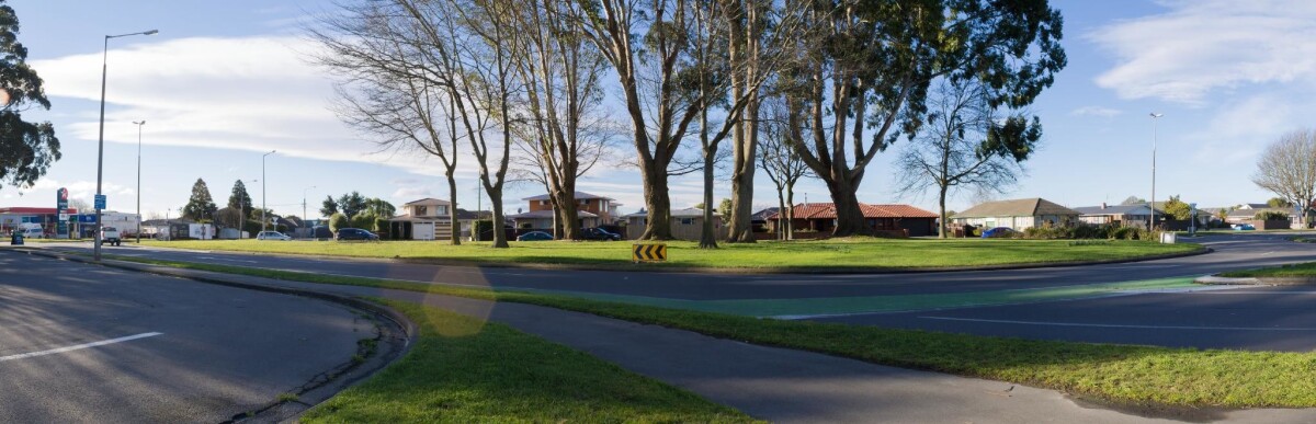 Panorama of Bishopdale roundabout taken from Bishopdale Village Mall carpark on Harewood Road.