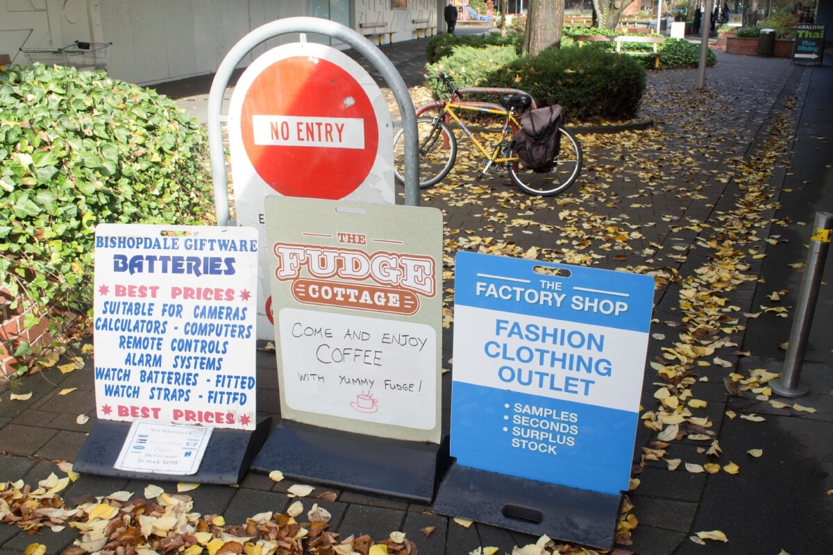 Close-up of a-frame signs at Bishopdale Village Mall for Bishopdale Giftware Batteries, The Fudge Cottage and The Factory Shop clothing outlet.