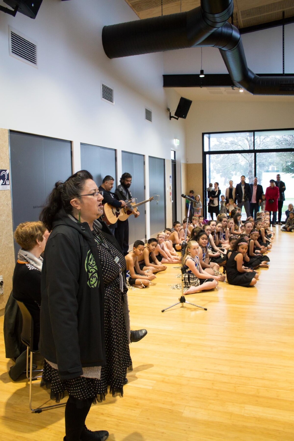 A traditional Māori ceremony to mark the opening of Ōrauwhata: Bishopdale Library in one of the community rooms. Students from a local intermediate school assist in the ceremony.