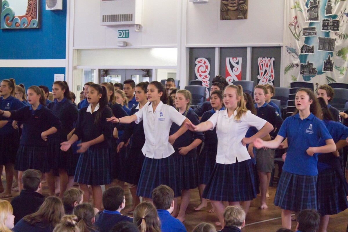 Breens Intermediate School Kapa Haka group performing to other students in the school hall at 85 Breens Road, Bishopdale.