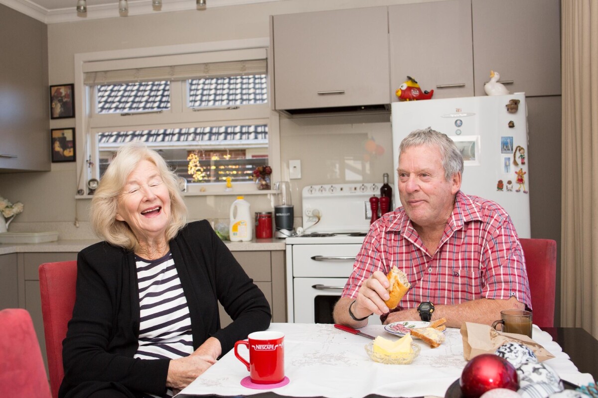 Raymond and Colleen having afternoon tea in their house on Farrington Avenue, Bishopdale.