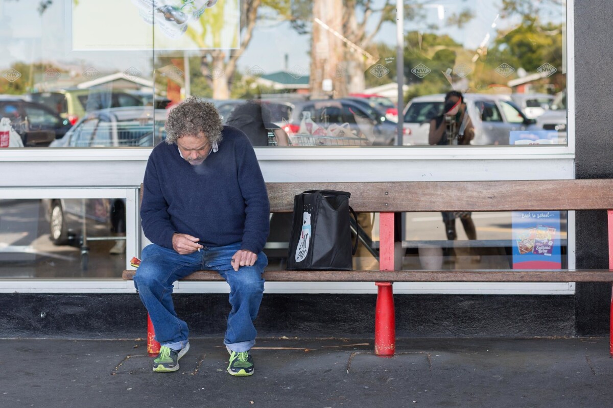 Local man smoking a cigarette outside the New World supermarket at Bishopdale Village Mall, Bishopdale.