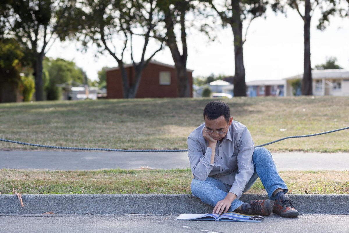 William sat on the kerb reading a book at the Bishopdale Village Mall car park, Bishopdale.