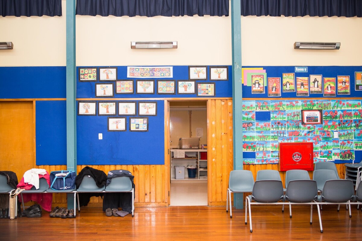 Interior of the Isleworth School hall decorated with students artwork at 59A Farrington Avenue, Bishopdale.