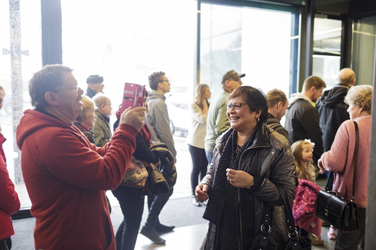An excited women gets a photo in front of the doorway to Ōrauwhata: Bishopdale Library on opening day.