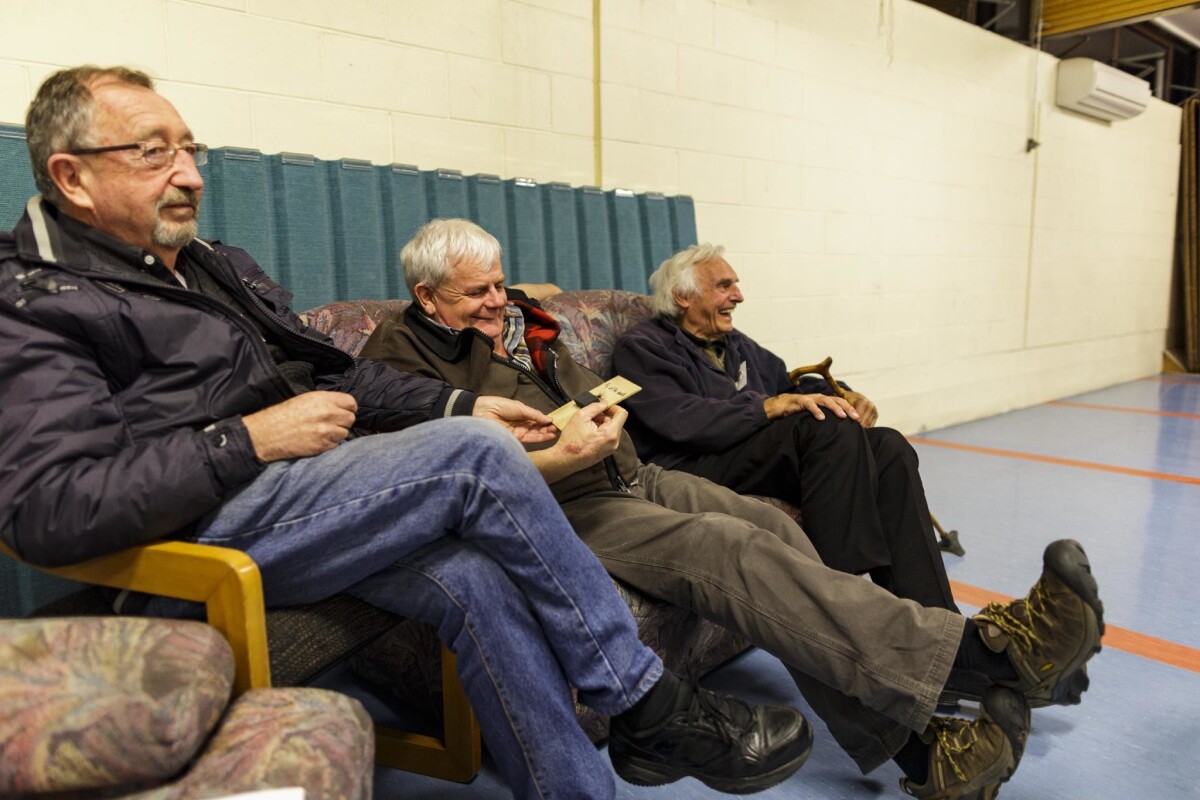 A group of three men listening to the guest speaker at Fishing and Casting Club at 37 Colesbury Street, Bishopdale.