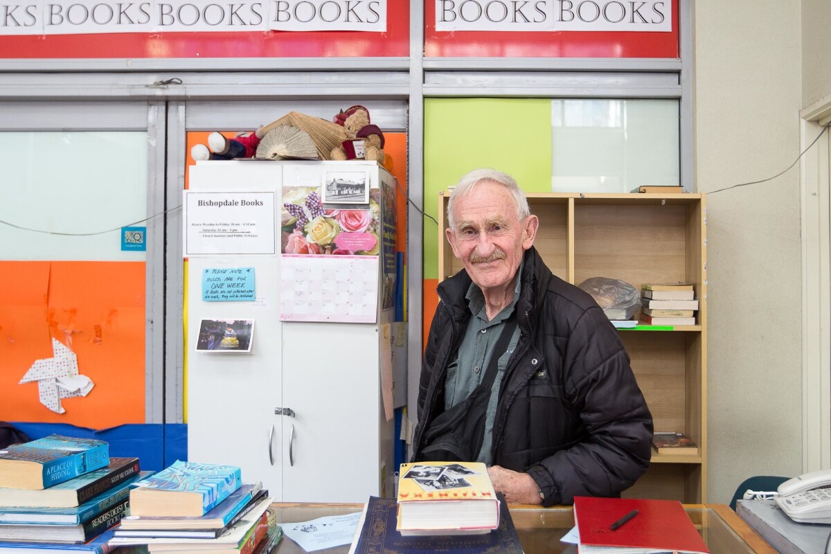 The smiling face of book store owner, Alex, stood behind the counter of Bishopdale Books, the second hand book store in Bishopdale Village Mall.