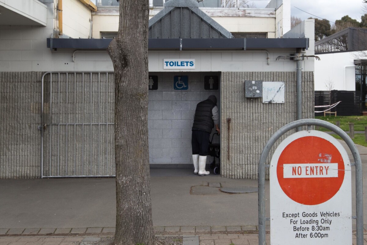 A man in gum boots entering public toilets at Bishopdale Village Mall, Bishopdale.