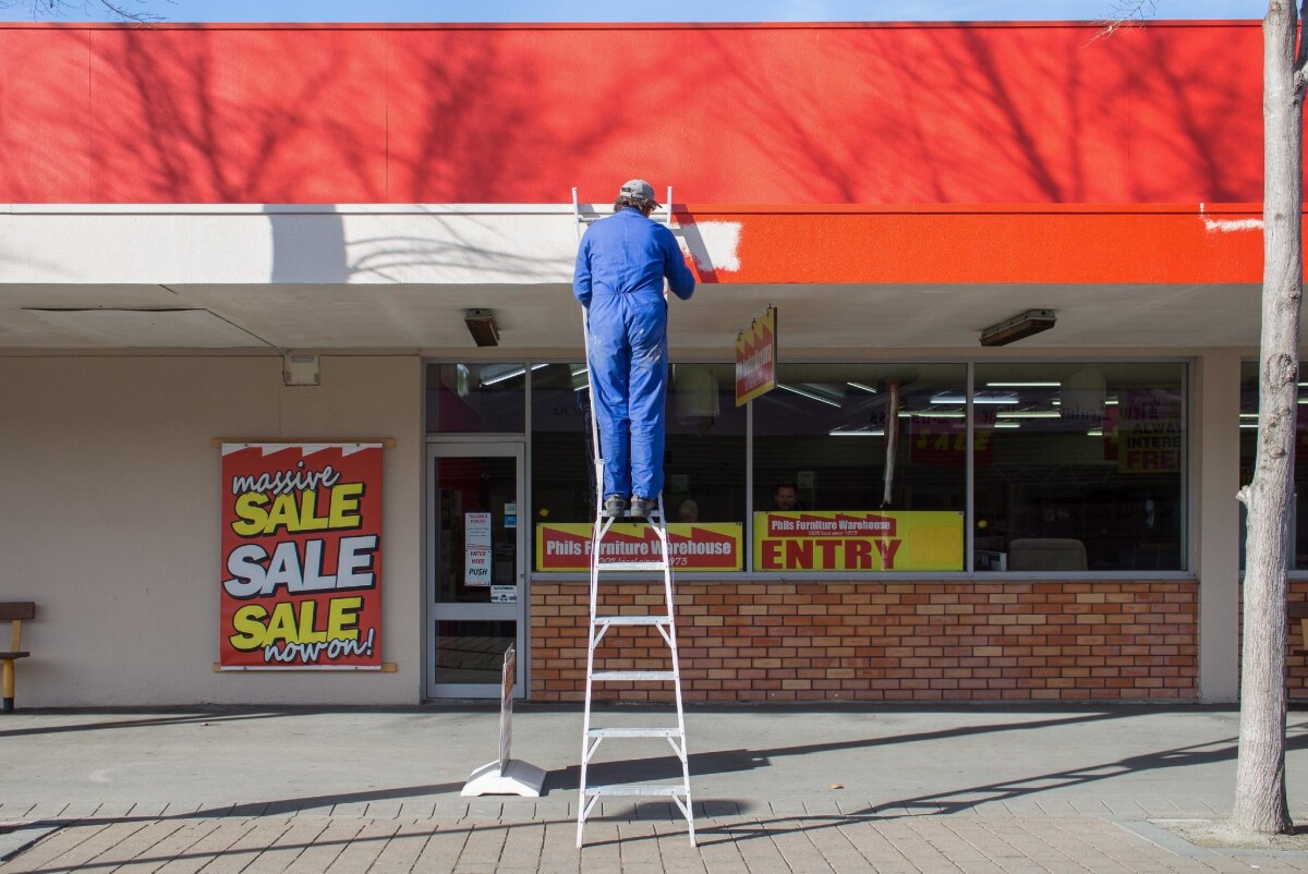 A man up ladder painting the outside of Phil's Furniture Warehouse at Bishopdale Village Mall, Bishopdale.