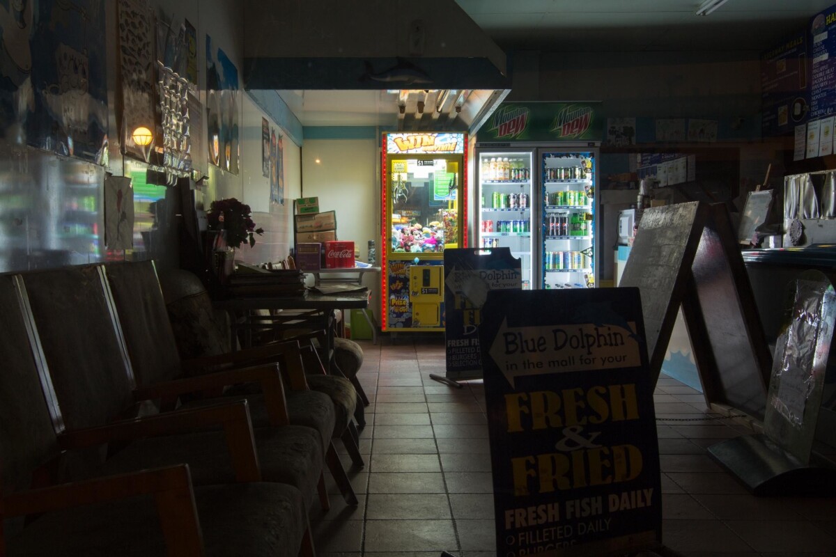 Interior of the Blue Dolphin Fish and Chip shop at Bishopdale Village Mall, packed down at night. In the centre are three a-frame signs which have been brought in from outside.