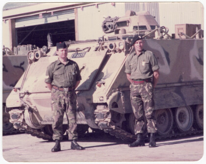 Bruce Keddie, left, and Ron Cone next to a New Zealand army tank ...