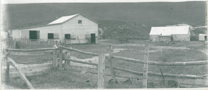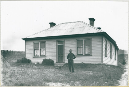 Owen McKee Snr standing in front of Waihaorunga Farm 1909.