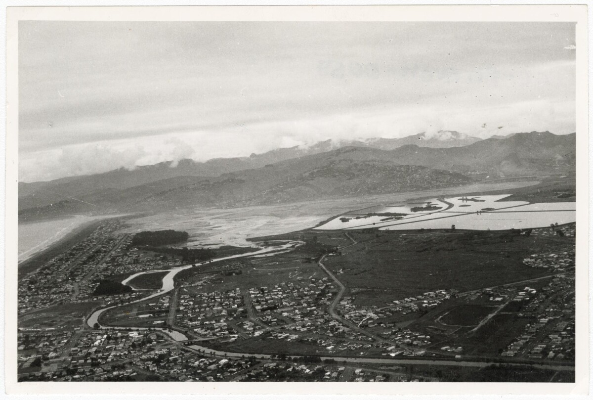Aerial view of the Estuary looking over Bromley the Avon River, New Brighton and Southshore across the Estuary to Mount Pleasant, Redcliffs and to the Port Hills.