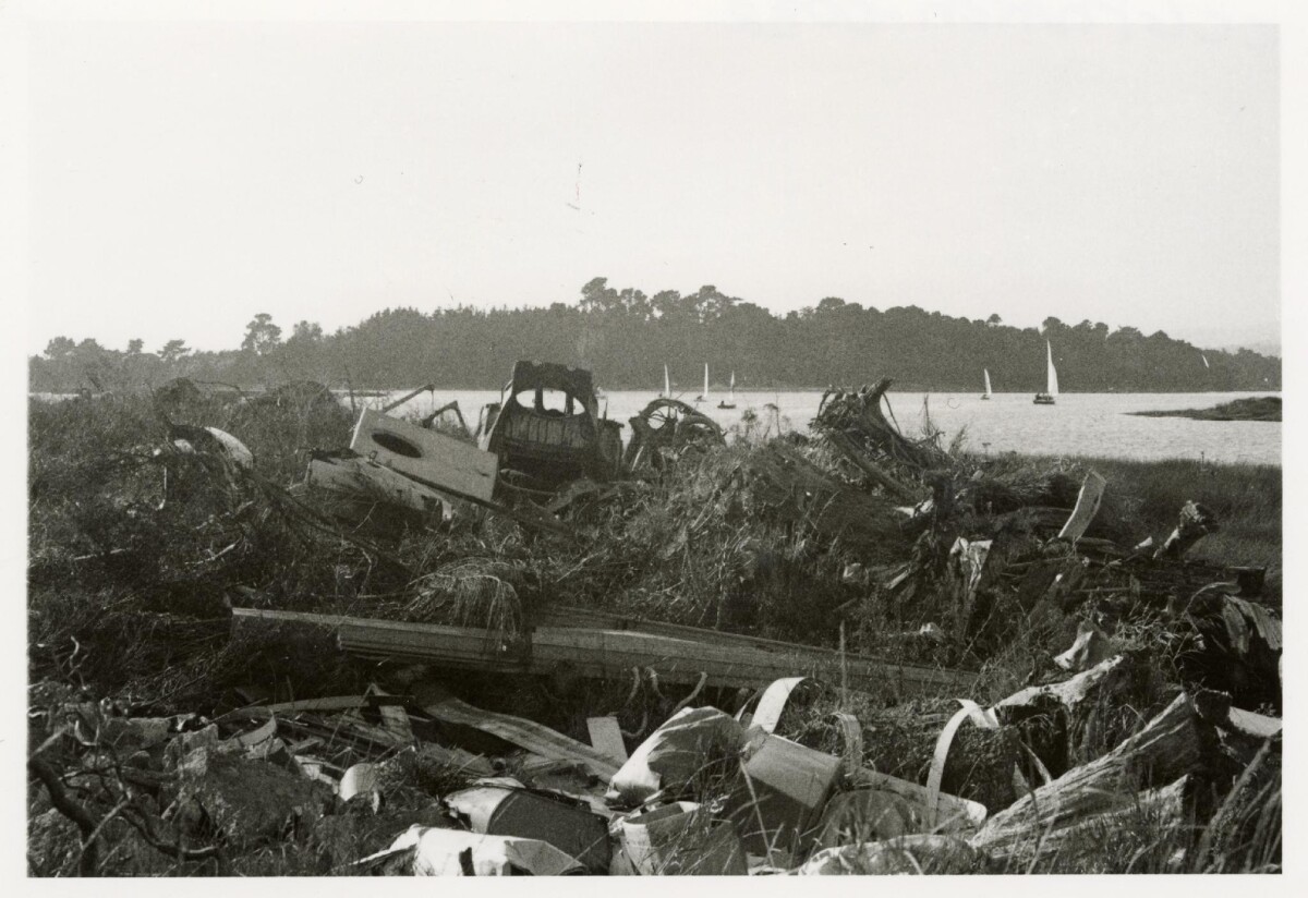A pile of rubbish piled up along the banks of the estuary. The estuary is in the background with sailboats on the water.