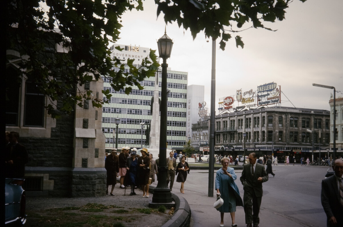 View from next to ChristChurch Cathedral looking towards the Citizens' War Memorial and west across Cathedral Square. In the foreground are groups of people, possibly leaving the Cathedral after a service.