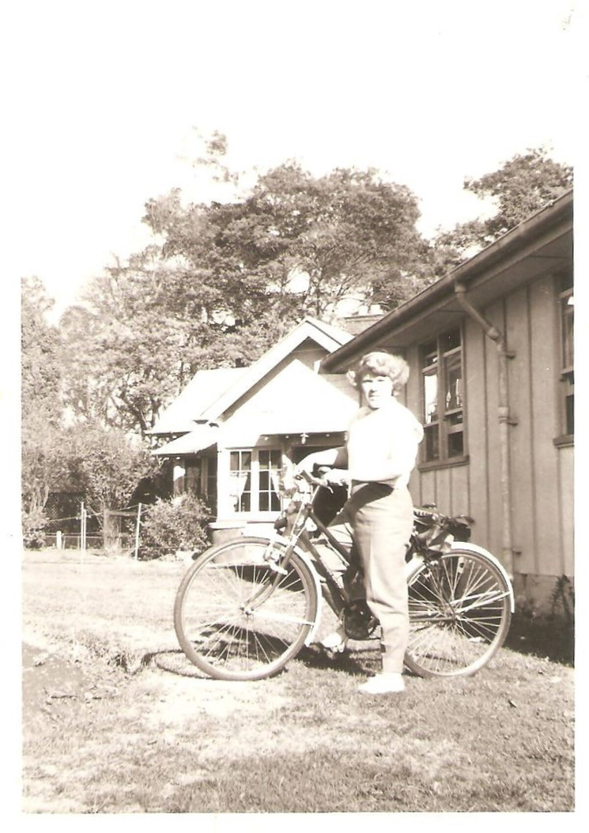 Josie Barsby (nee gates) ready for a cycle trip. Taken outside the Women's Immigration Hostel on Hansons Lane, Upper Riccarton.