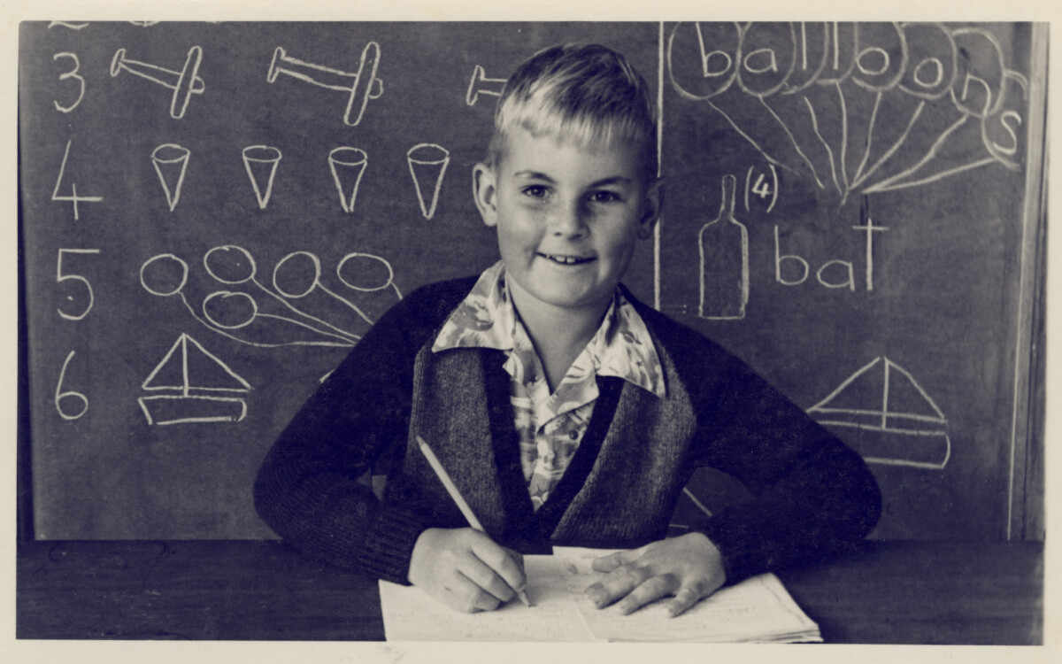 Portrait of Tony Marker, aged 9, sat in a classroom in front of a chalk board at Belfast School.
