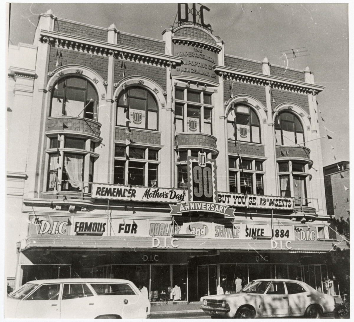 Exterior of the D.I.C Department store building on Cashel Street, decorated with 90th anniversary and Mother's day signage.