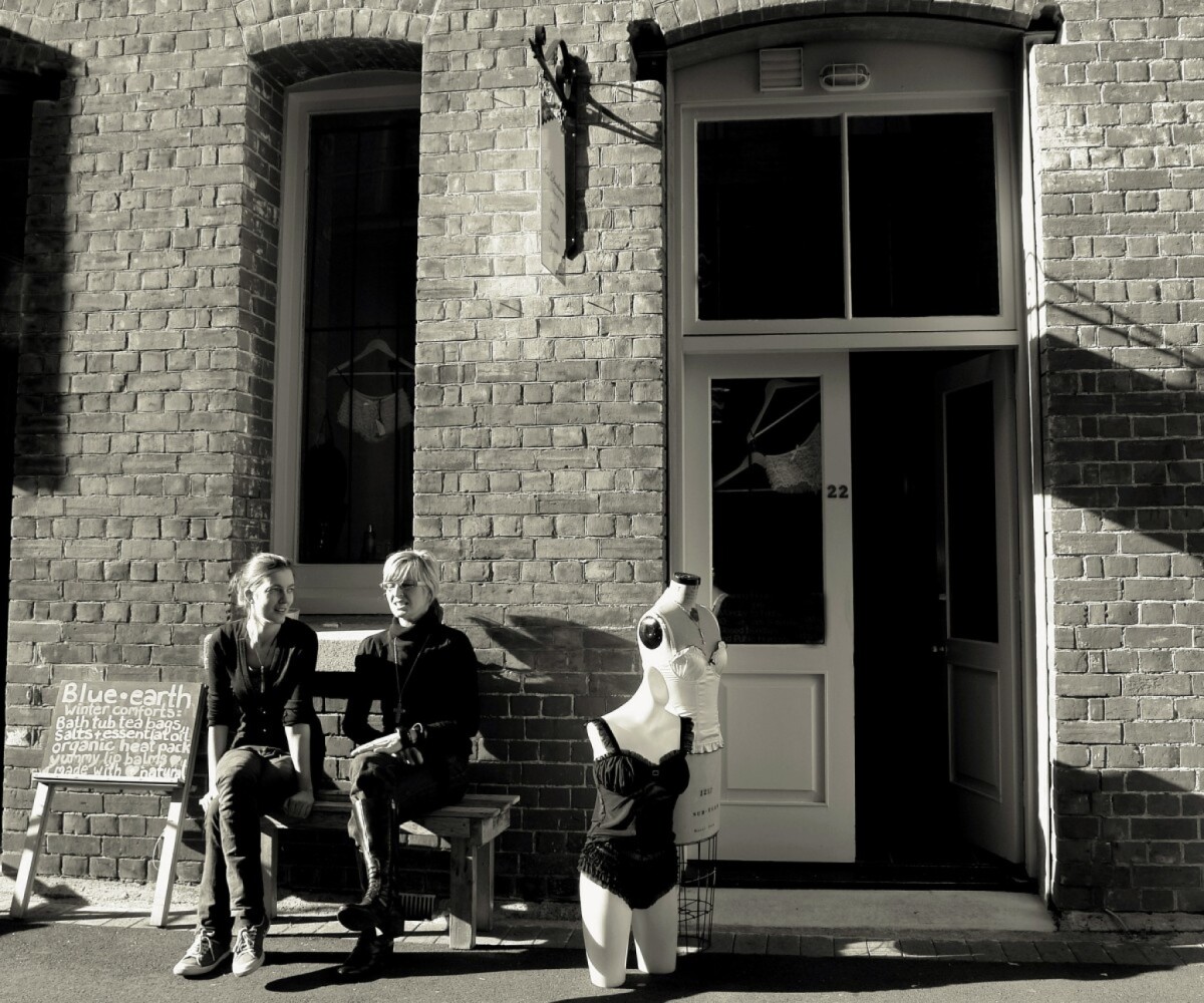Two people sat outside enjoying the sunshine in front on Blue Earth gift shops in Poplar Street.
