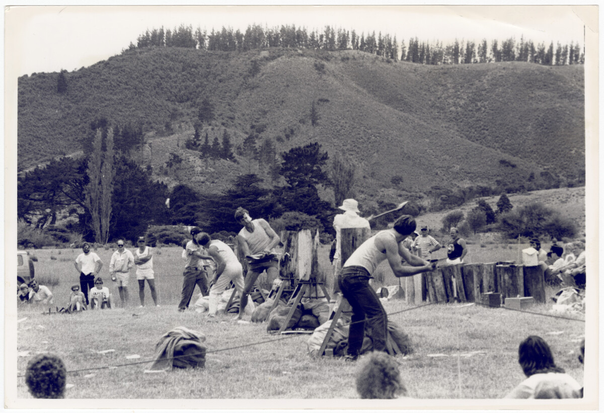 A group of men participating in an wood chopping competition at the Hopai Sports training grounds. The competition is part of a range of activities as part of the Pelorus Sound Sports Club annual land and water sports meeting in the Marlborough Sounds.