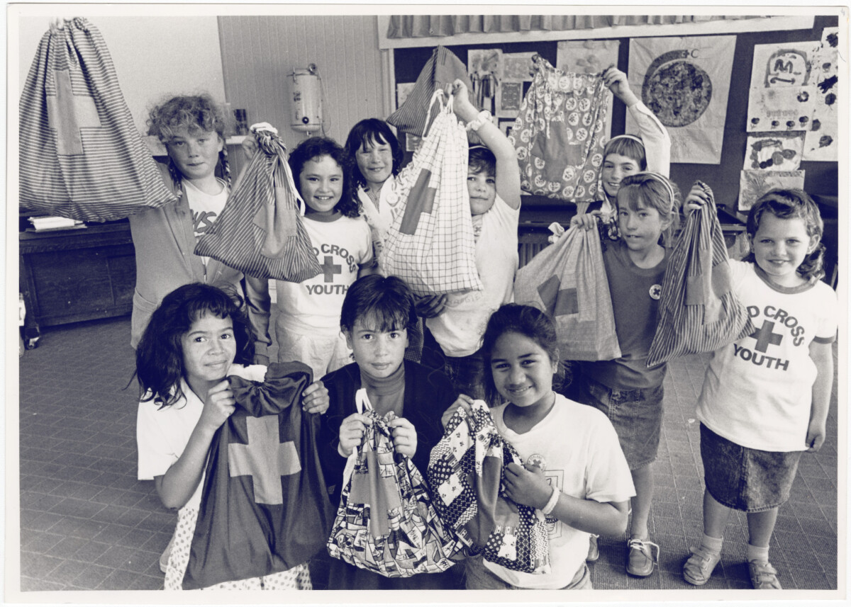 A group of students from Wharenui school with Red Cross friendship bags they have been packing to be donated to refugees arriving in Auckland. Students are, back from left, Lara Jensen, Kara Coster, Nicola Walli, Carolyn Harrison, Victoria Sutton, Jenny Searle, Miranda Collins. Front: Ruth McConnachie, Gabrielle Mackey, Tutogi Too.